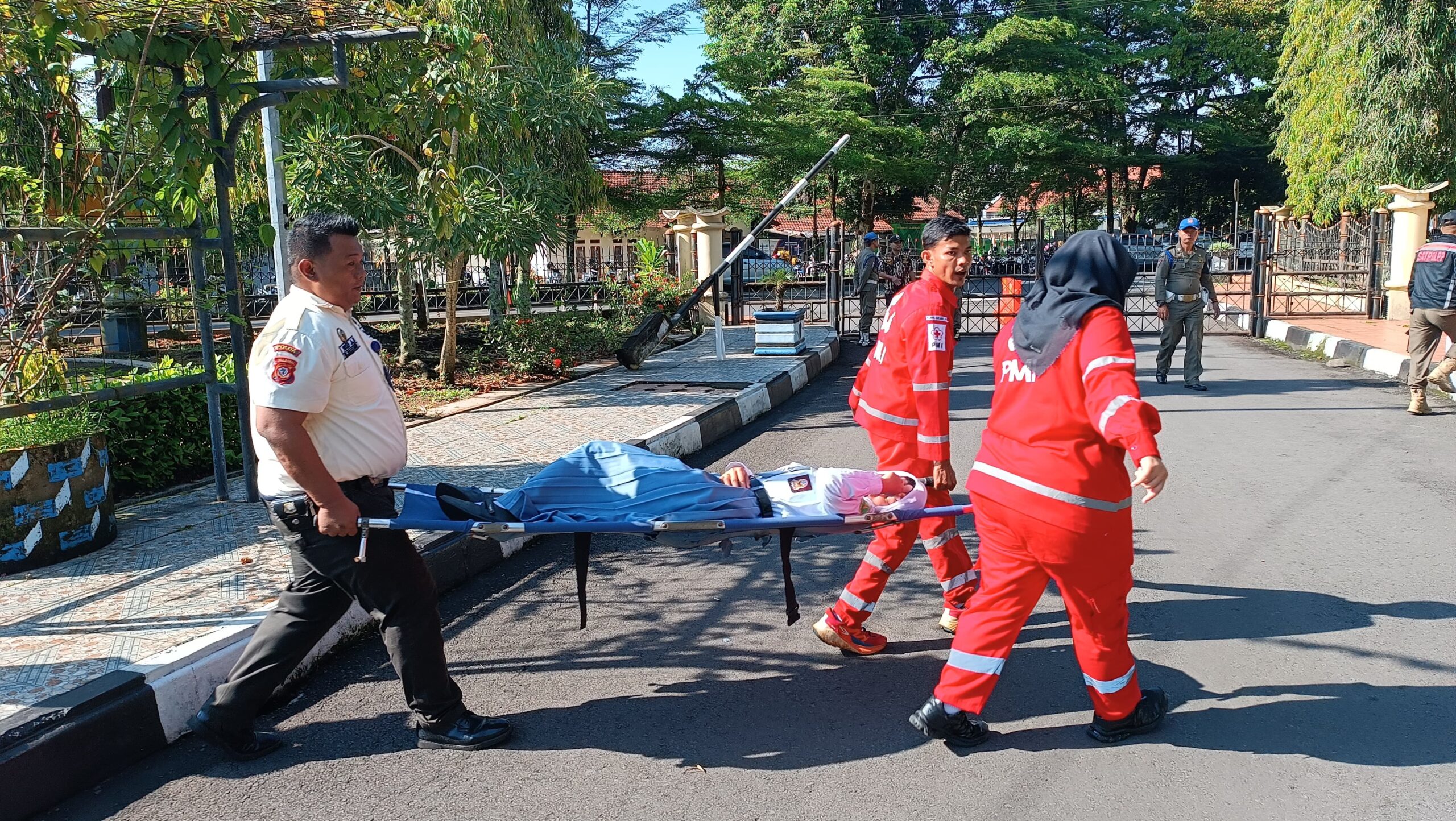 Satu per satu peserta yang tumbang dievakuasi oleh petugas kesehatan dibantu anggota satpam ke tenda medis darurat yang telah disiapkan di sekitar area upacara. Proses evakuasi berlangsung cepat agar kondisi peserta tidak memburuk.