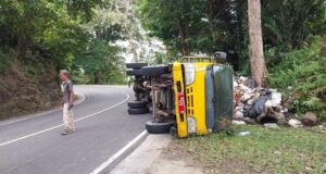 Hilang Kendali, Truk Sampah Terguling di Tikungan Emplak Pangandaran