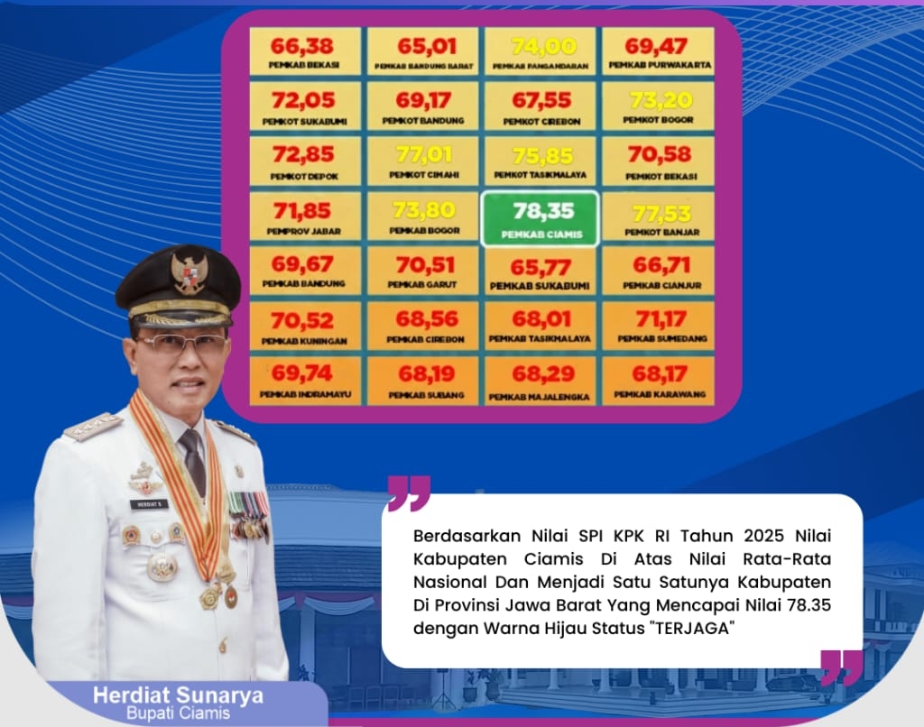 Capaian ini menempatkan Ciamis sebagai daerah dengan nilai SPI terbaik di Jawa Barat sekaligus melampaui hasil tahun sebelumnya yang masih berada pada kategori oranye “Waspada”.