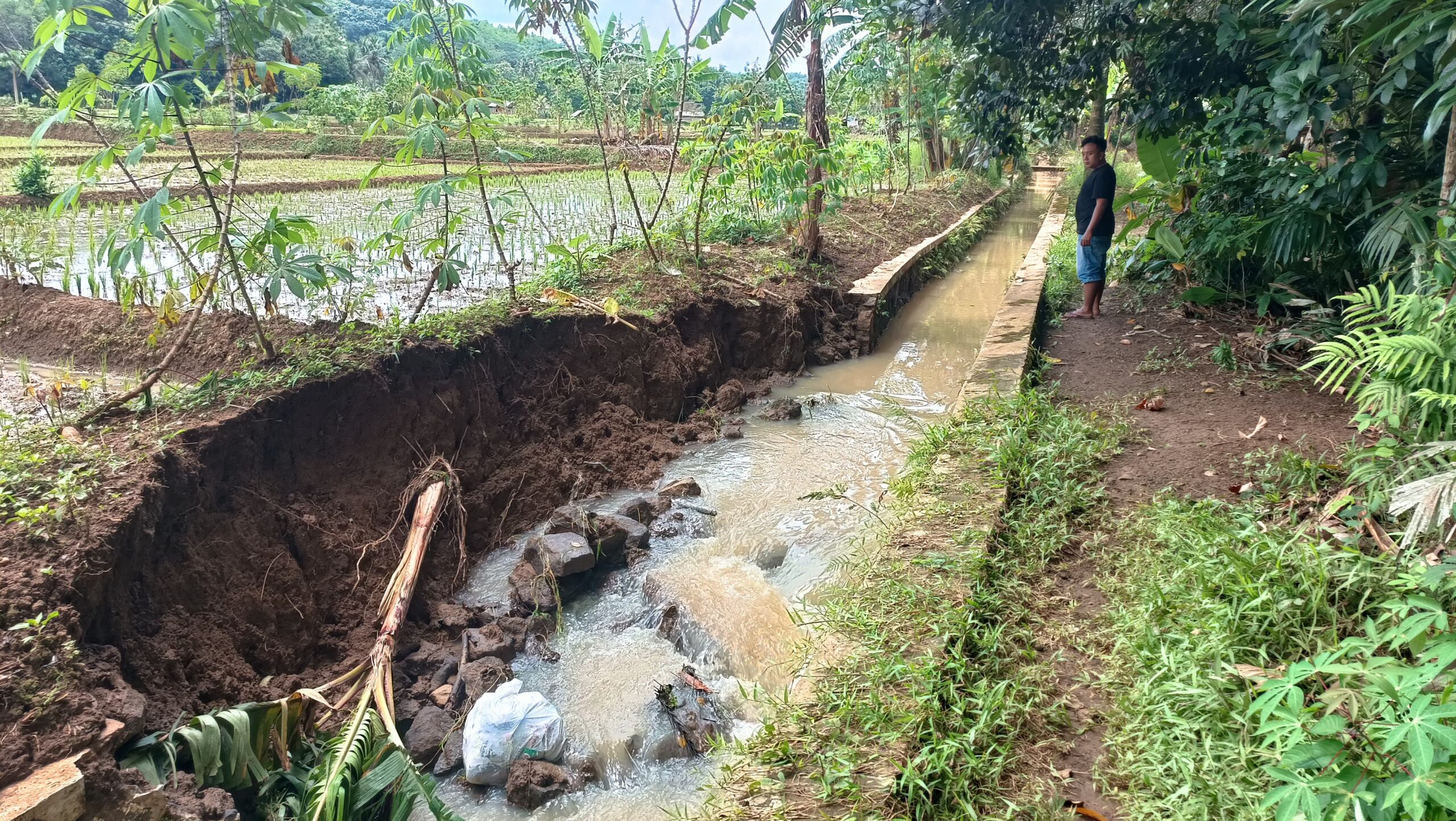 Ketua RT setempat, Begi, mengatakan ambrolnya kirmir ini mengancam area persawahan hingga puluhan hektar.