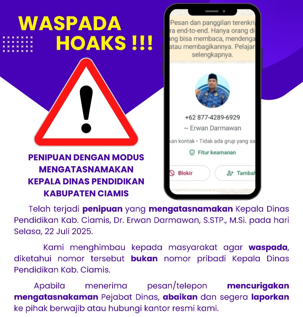 “Kami telah menerima laporan terkait upaya penipuan yang mengaku sebagai saya selaku Kepala Dinas Pendidikan,” ujar Dr. Erwan pada Rabu (23/7/2025).