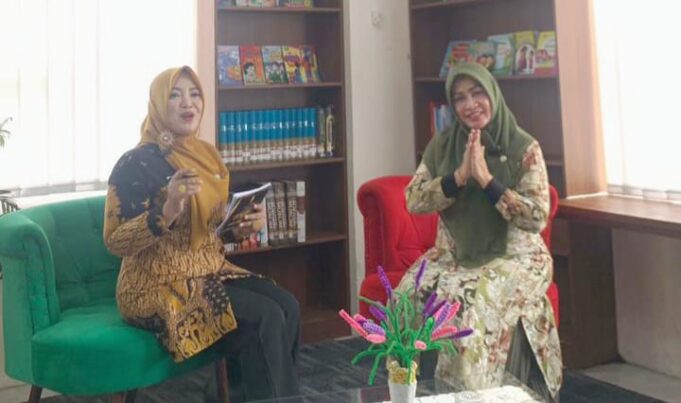 Ketua TP PKK Kota Banjar, Hj. Hetty Sudarsono (kanan) saat menghadiri undangan sebagai bintang tamu dalam Talkshow Pokja II yang digelar di auditorium Gedung Perpustakaan Kota Banjar. Foto/Hermanto.PasundanNews.com