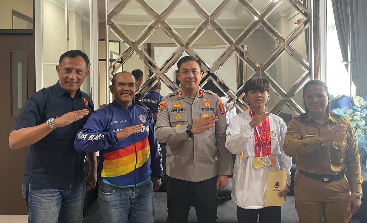 BERITA PANGANDARAN, PASUNDANNEWS.COM – Kapolres Pangandaran AKBP Dr. Andri Kurniawan, memberikan apresiasi kepada Callista Aurelia Orlin, siswi SMPN 1 Pangandaran yang meraih medali emas dan perunggu pada ajang Pekan Olahraga Pelajar Nasional (Popnas) XVII Jakarta 2025.
