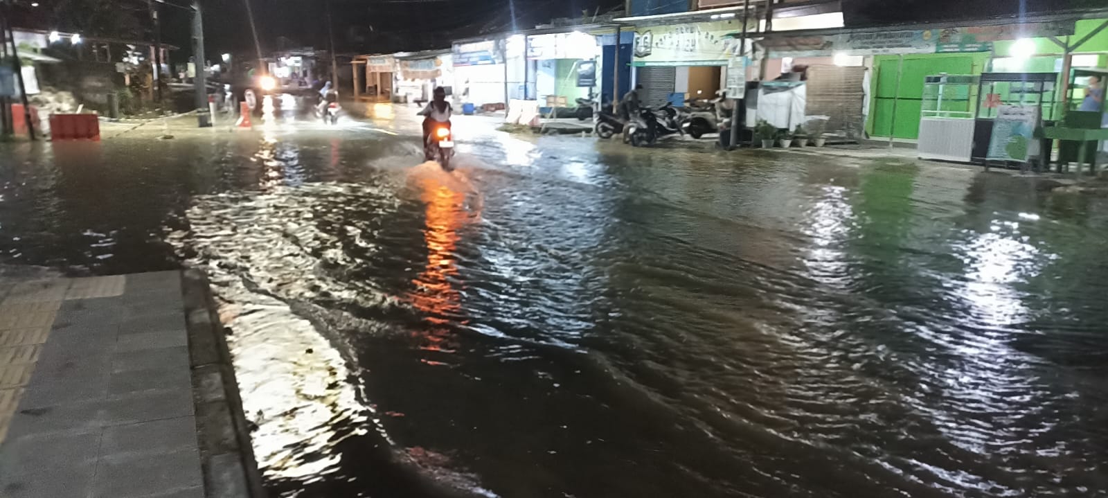 Banjir mulai terjadi sejak sore hari dan hingga malam ini masih terus menghambat arus lalu lintas di kawasan tersebut. Kendaraan yang melintas terpaksa berjalan pelan karena badan jalan terendam air.