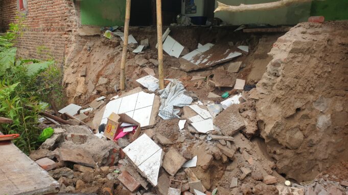 “Kejadiannya memang sudah terlihat sejak satu minggu ke belakang, tapi tadi pagi sekitar pukul 07.00 WIB bagian belakang rumah ambruk cukup parah karena tanahnya terus tergerus air di bawahnya,” ujar Ikbal.
