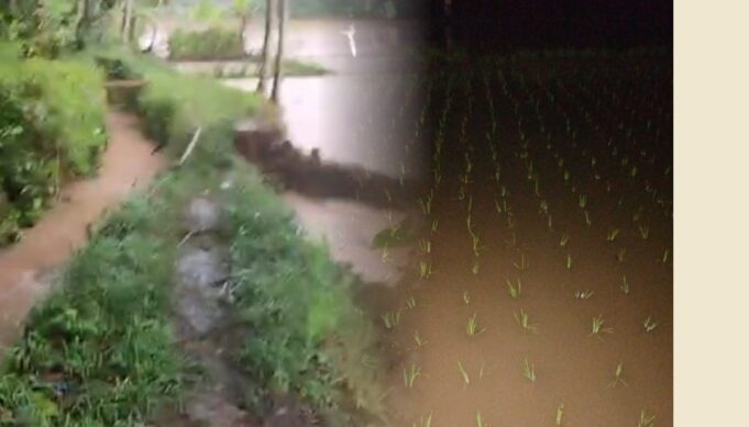Air yang meluap kemudian mengalir ke area pertanian dan menenggelamkan lahan padi yang sebagian besar baru saja ditanami.