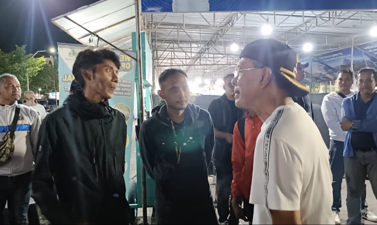 Ketua Umum DPD Balad Galuh, Ghozin (tengah) saat berbincang dengan Manager PSGC yang juga Bupati Ciamis Herdiat Sunarya (kanan) di area stadion kita Barat Solo. Foto/Istimewa
